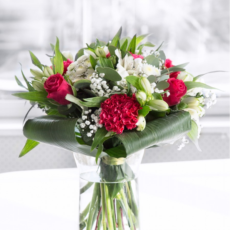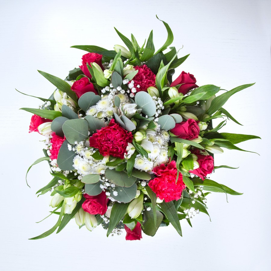 Introducing our Opulent Grace Bouquet, where beauty meets sophistication. This unique arrangement blends the timeless elegance of white chrysanthemums and gypsophila with the bold allure of red roses and carnations, gracefully arranged with white alstroemeria and rich aspidistra leaves.